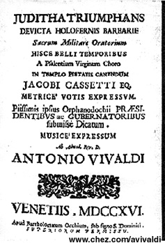 La "Judith triumphans devicta Holofernes barbarie" de 1716, qui défie la norme en niveau de la très lourde orchestration requise. Le roulement de timbales au début (deuxième mesure en partant du bas) s'enchâine sur les trompettes (mesure du haut), puis les hautbois (deuxième mesure depuis le haut) avant que les tutti des cordes emportent ce qu'il reste encore d'energie (3eme et 4emes partitions et celle du bas, celle du continuo). Simple mais percutant, fallait y penser. A droite, le livret qui était distribué à l'entée du concert à la Pietà en 1716 (j'y étais pas !!! snif !!).